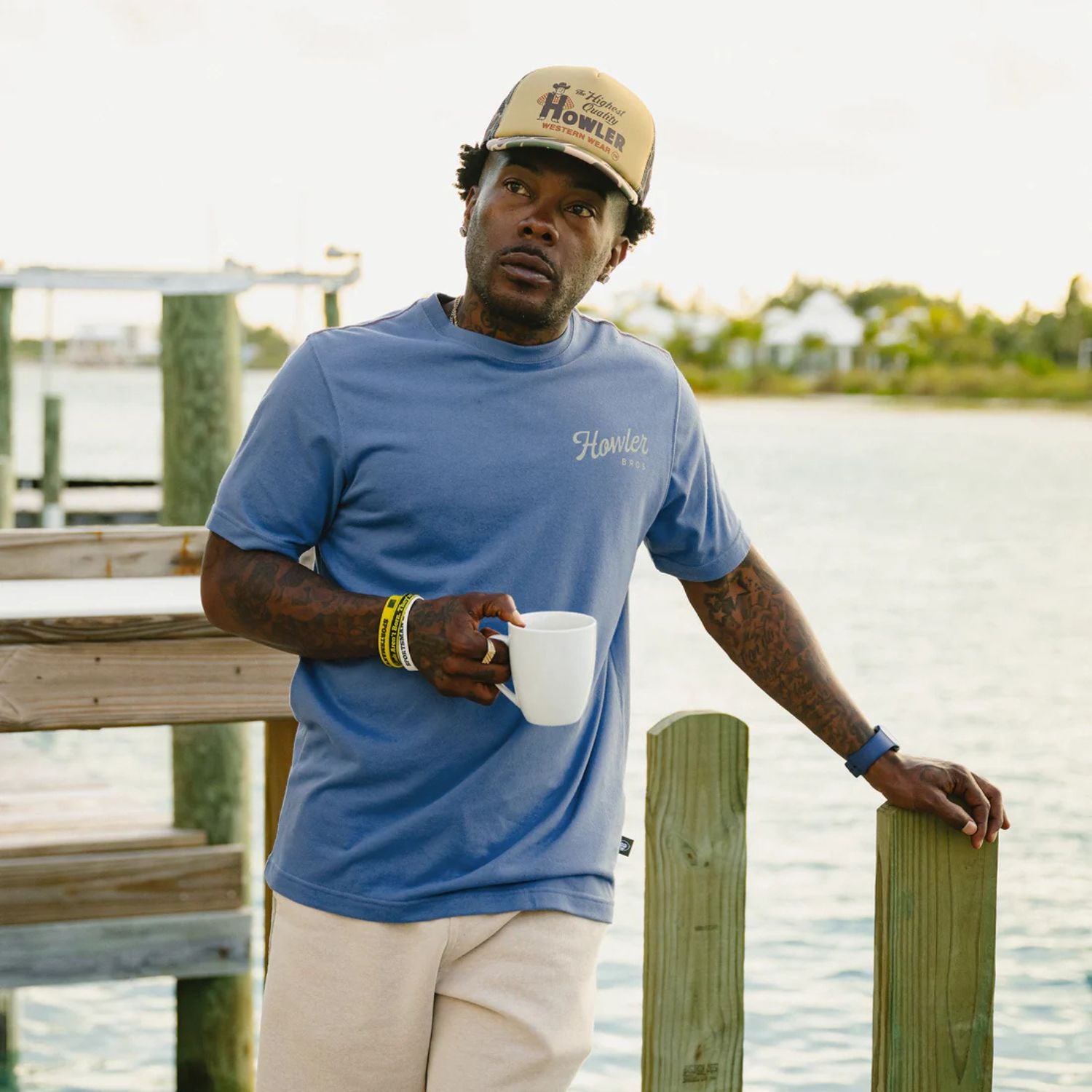 The Howler Brothers Posse T-Shirt puts classic Howler artwork front and center on a dependable everyday tee. Made from a soft cotton-poly jersey blend, it delivers a lightweight feel that stays comfortable through long days and regular wear. The fabric holds its shape while maintaining a smooth, broken-in hand feel. Finished with contrast taping, shoulder stitching details, and a soft-touch water-based screen print, this regular fit tee is built for steady rotation without missing a step.