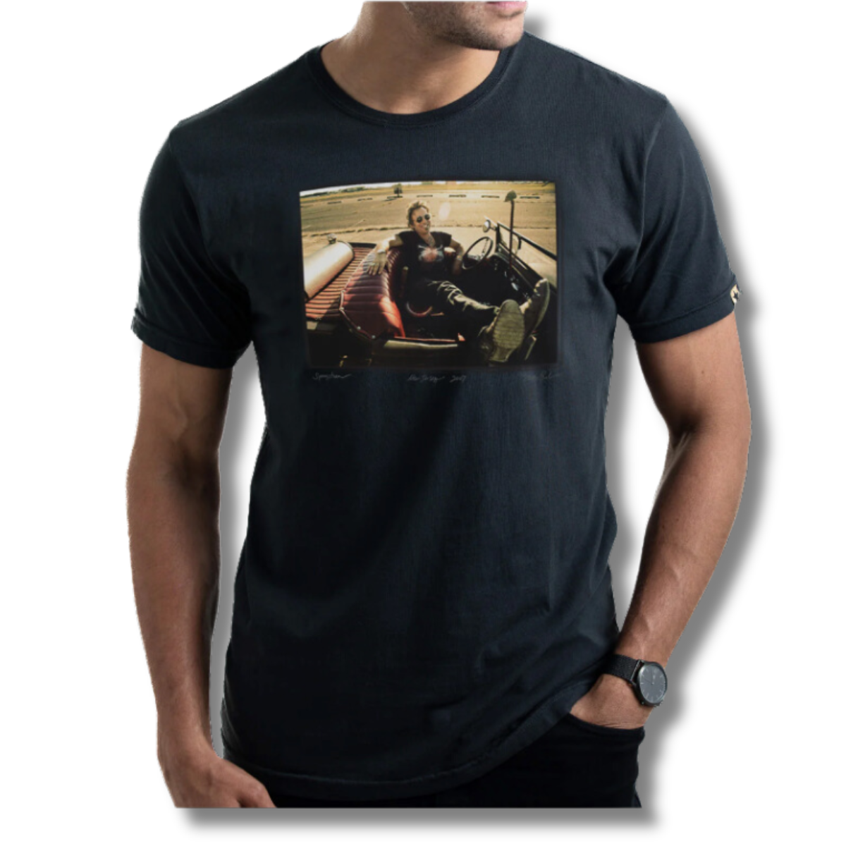 The Bruce Car Tee from the Clinch Collections is a slim fit, vintage-inspired piece crafted from 100% combed ring-spun cotton. Garment-dyed and vintage-washed, it delivers a super soft, velvety feel for everyday comfort. This tee is preshrunk to maintain its perfect fit over time and is created and finished in California. The artwork featured on the tee is a photograph personally selected by Danny Clinch and is produced with the artist's permission.