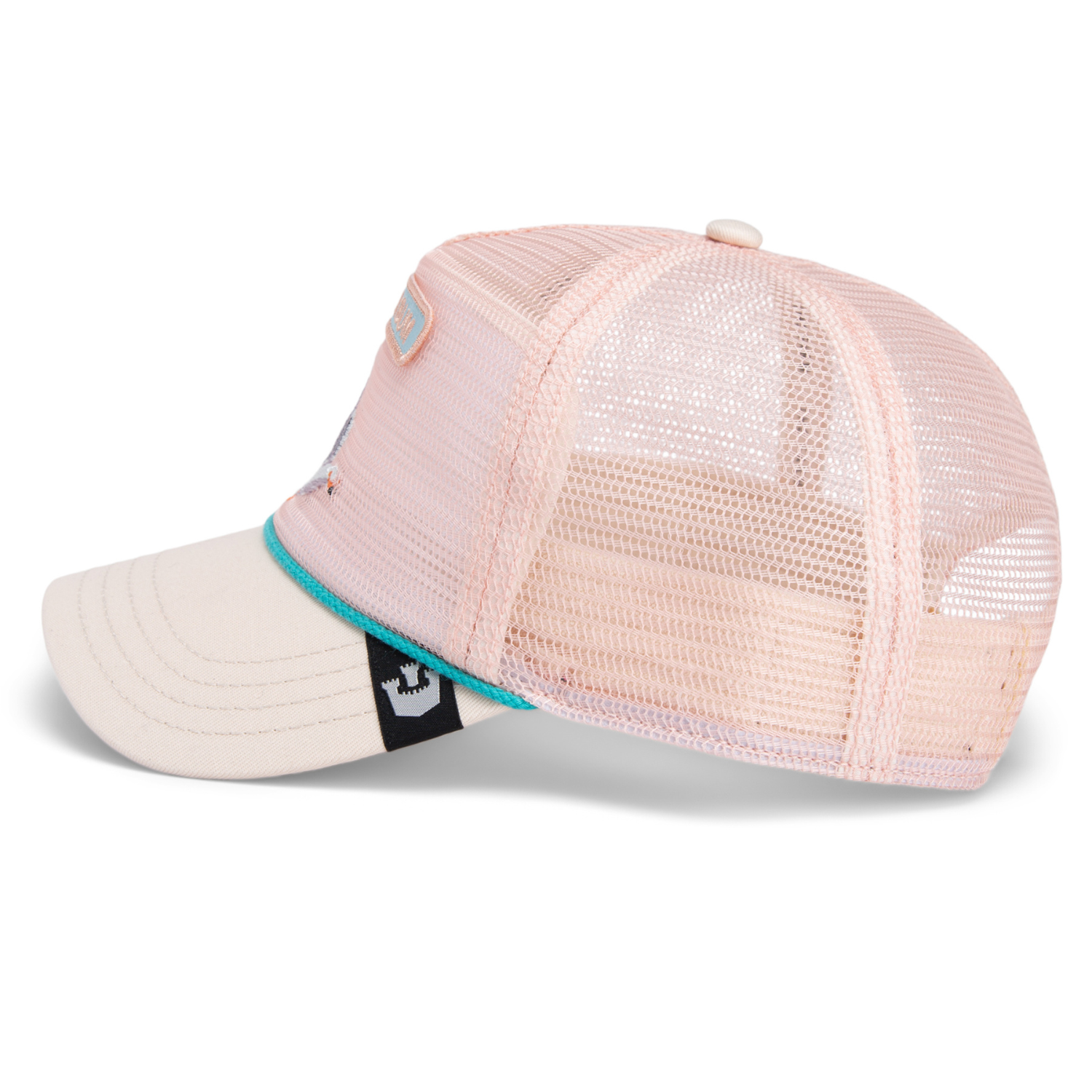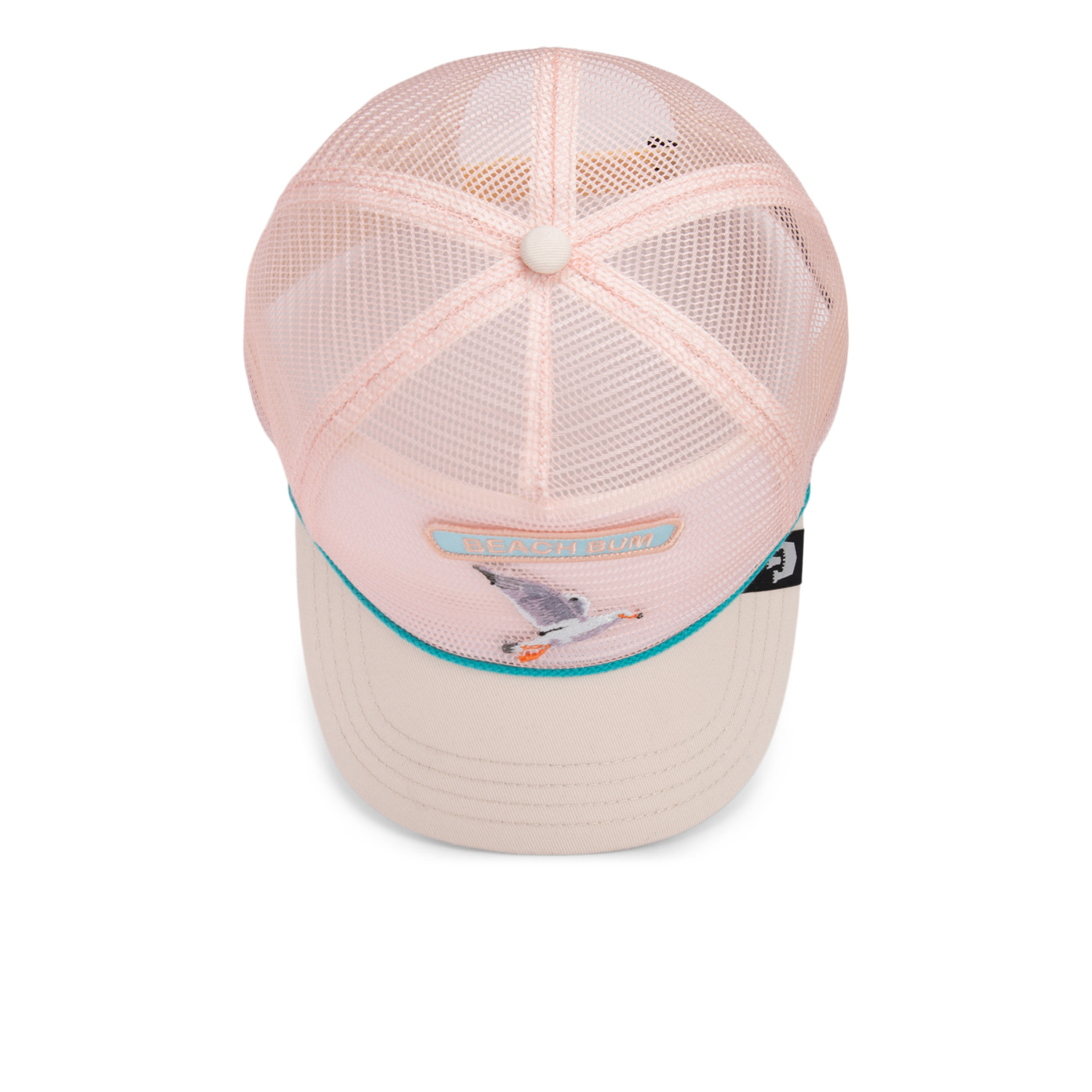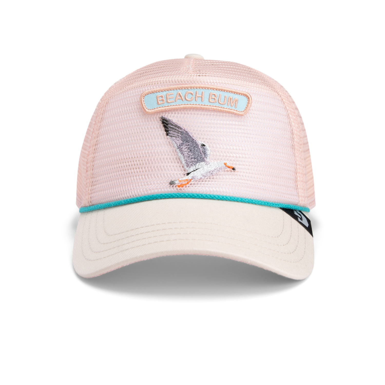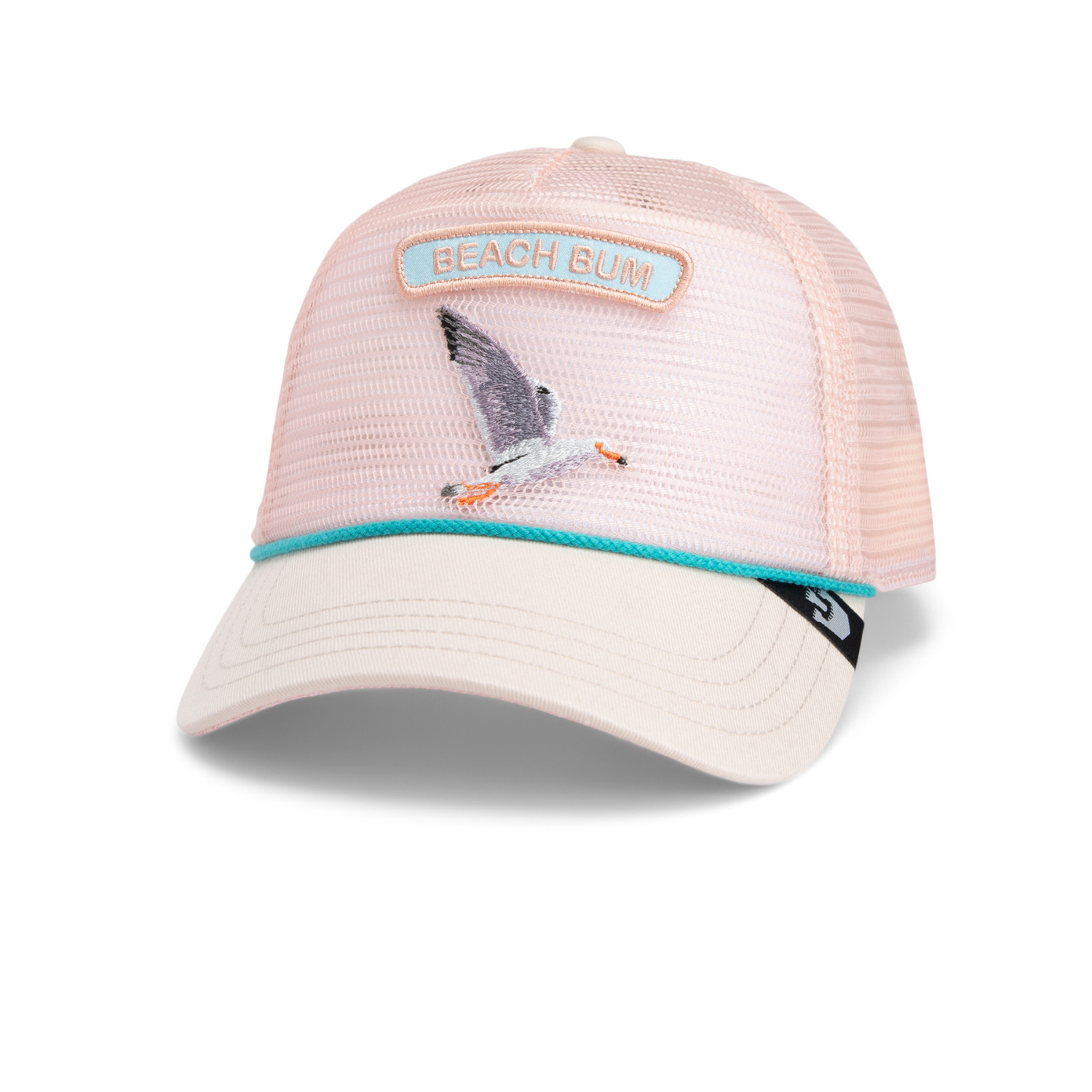 - Details: Embroidered seagull and “BEACH BUM” patch, rope trim detail, mesh back, structured front panel, branded brim tag