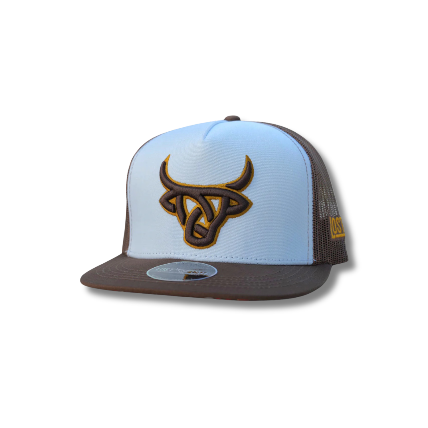 The two-tone Lost Calf Baseball Cap brings a bold contrast with a timeless design. Featuring the Lost Calf logo embroidered on the front in brown and "Lost Calf" stitched on the left side, this cap delivers a clean and rugged look. Designed with a structured, high-profile 5-panel build, it holds its shape with a durable buckram front lining, while the classic mesh back ensures breathability. A quilted comfort sweatband and unique under-visor add to the refined details for all-day wear. Finished with a flat bill and an adjustable snapback closure, this cap is made for the perfect fit every time.