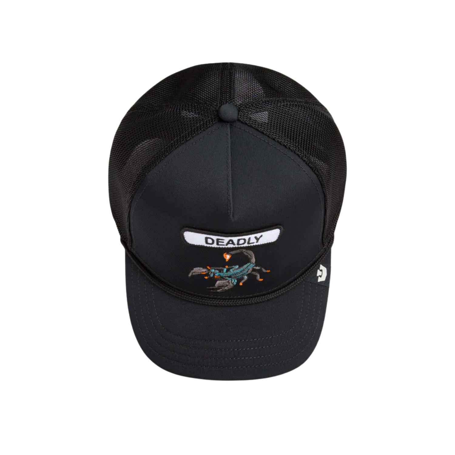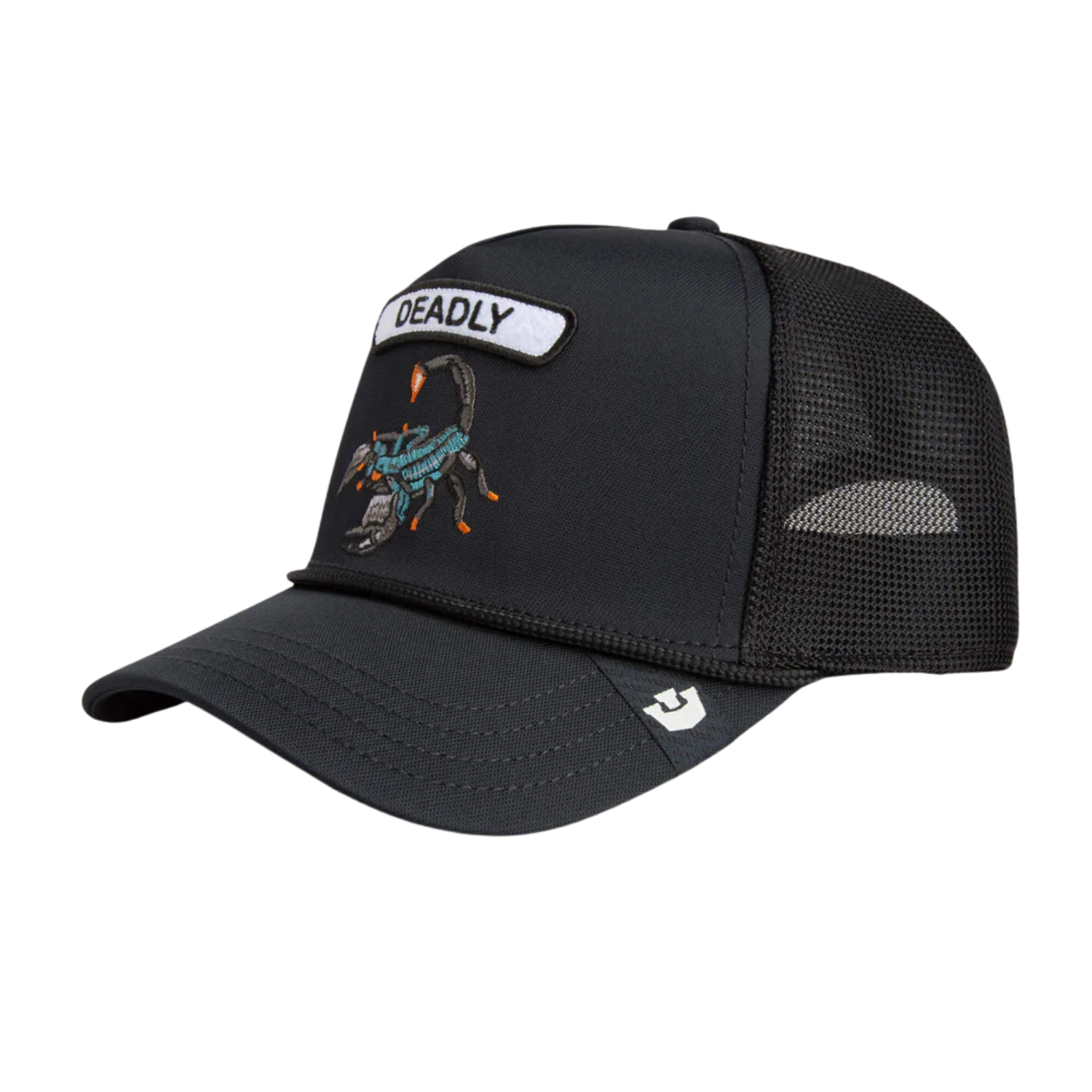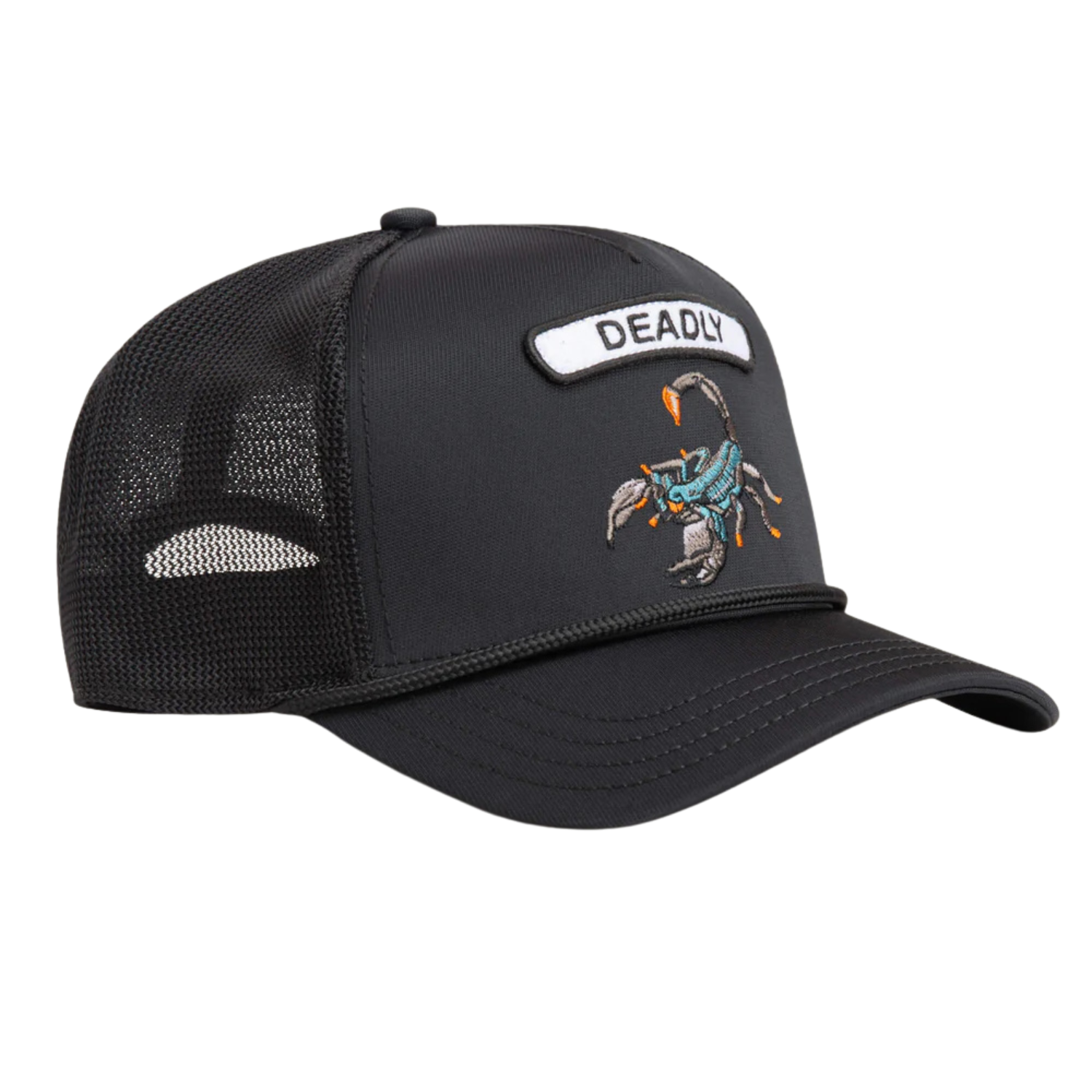 The GB2 Deadly Scorp Trucker by Goorin Bros brings edge to function with a matte black crown and a striking scorpion patch front and center. Designed for all-day wear, this cap features a breathable mesh back, a moisture-wicking sweatband, and a 2½" curved bill for a low-profile fit. The name says it all—deadly cool with just enough sting.