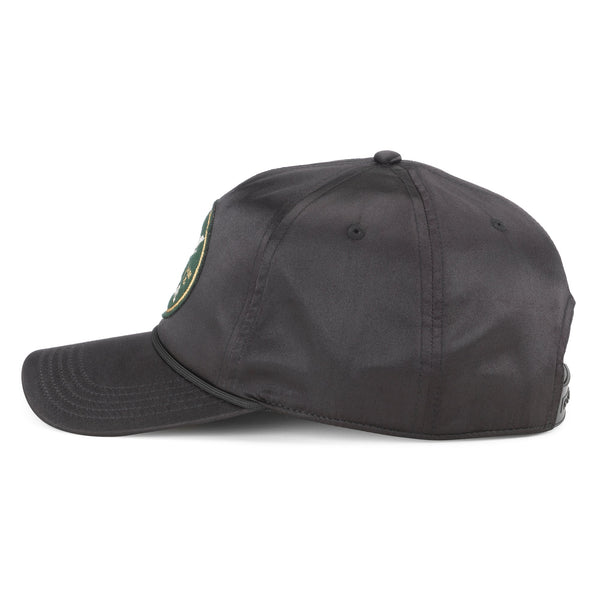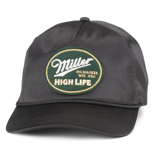 In deep charcoal, the cap features golden embroidery of the Miller High Life logo, accented by green that recalls the original branding. It's a nod to the history of Miller Brewing in Milwaukee, Wisconsin.