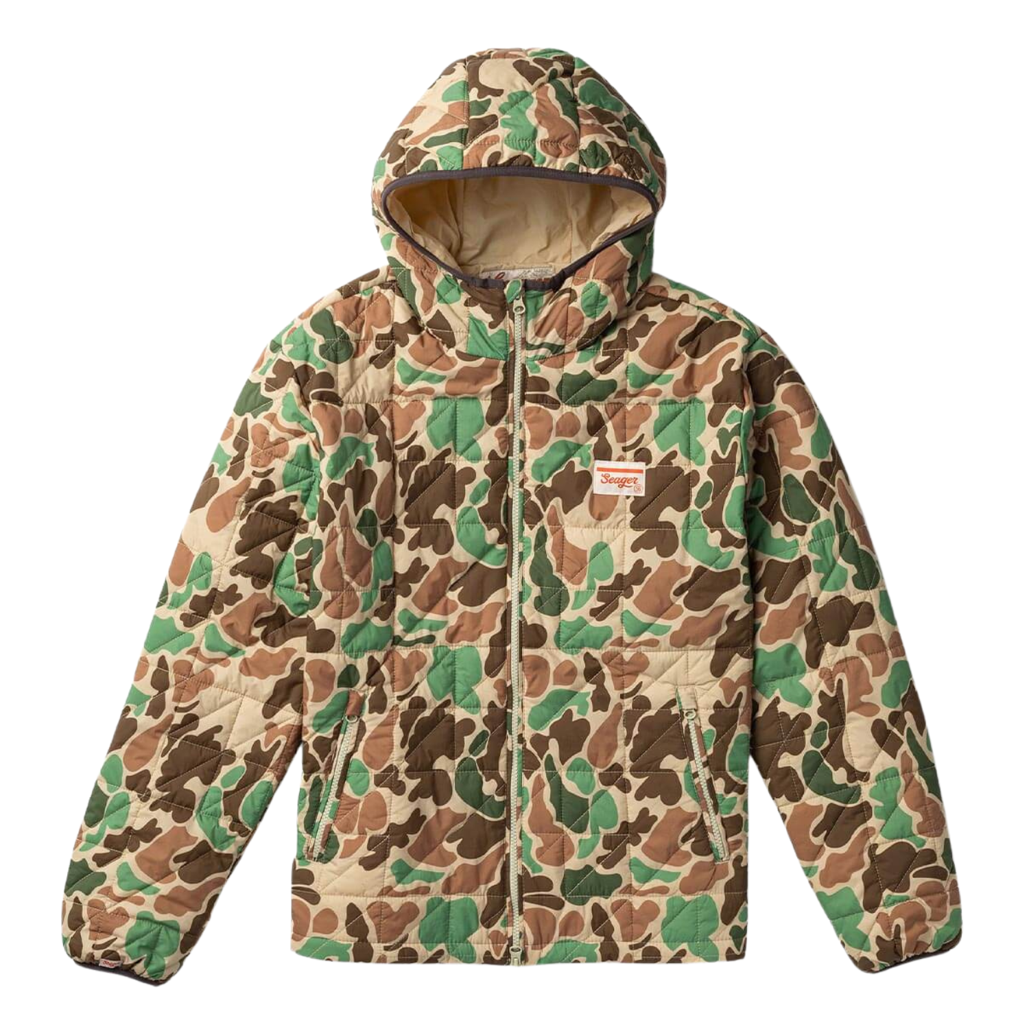 The jacket's signature quilt stitching, robust full zip front, and practical zip hand pockets bear the unmistakable Seager brand ethos. Not to forget, it packs a punch with its self-packable feature, folding neatly into an interior mesh pocket, ready for the road. It’s a true-to-size fit, with a thoughtful design that’s wide in the shoulders and narrows at the waist, zipping up high to fend off the early chills or the late night breeze. This jacket doesn’t just match your stride, it’s a step ahead, ensuring you're enveloped in warmth whenever you step out the door.