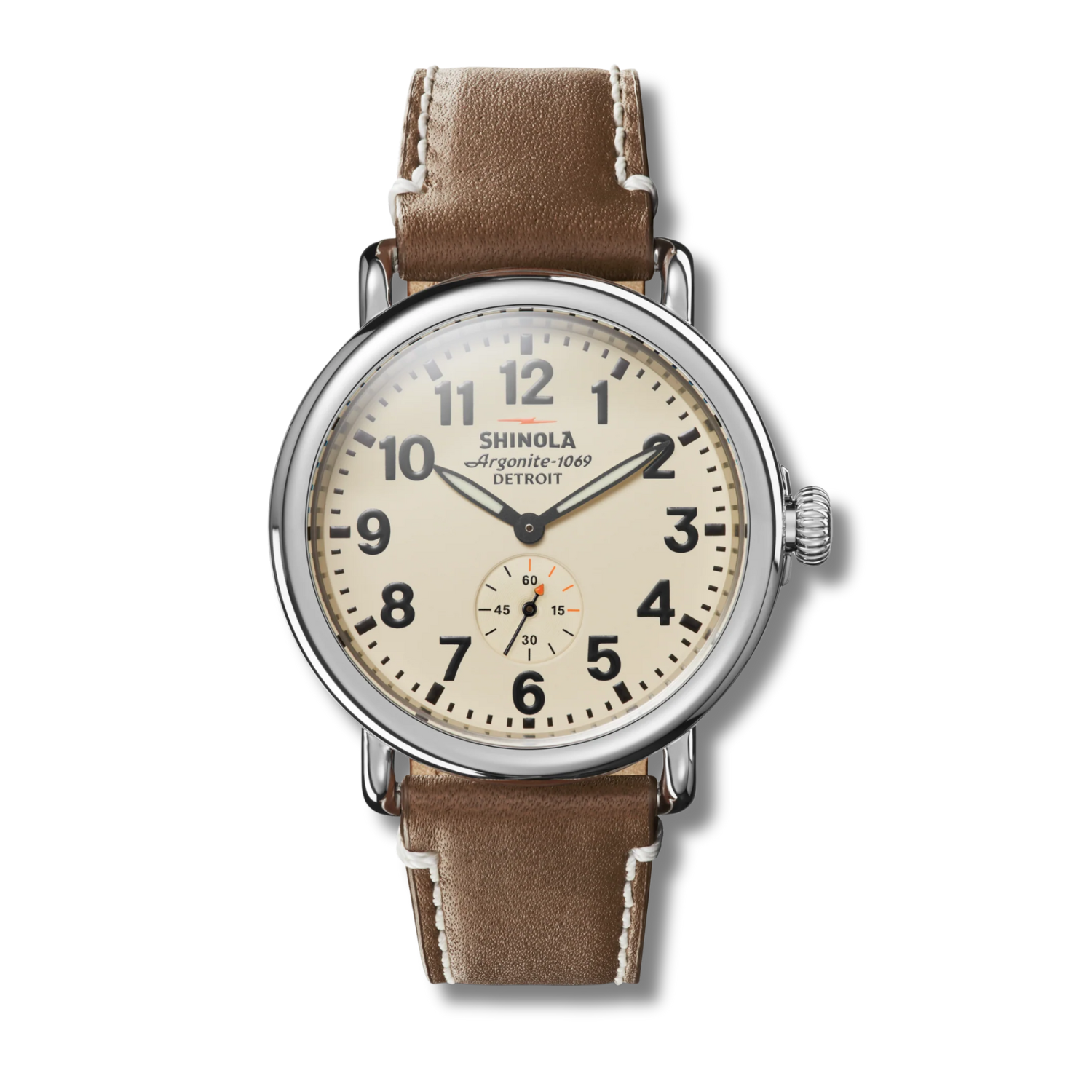 The Runwell 41mm Watch in Cream by Shinola is a study in timeless design and enduring quality. Powered by the Argonite 1069 high-accuracy quartz movement, it features a polished stainless steel case with Shinola’s signature pumpkin crown and a cream dial with sub-second display. A Dark Nut Brown leather strap complements the refined face, making this watch as versatile as it is dependable. Each Runwell is finished with a laser-etched serial number on the caseback, underscoring its lasting craftsmanship.