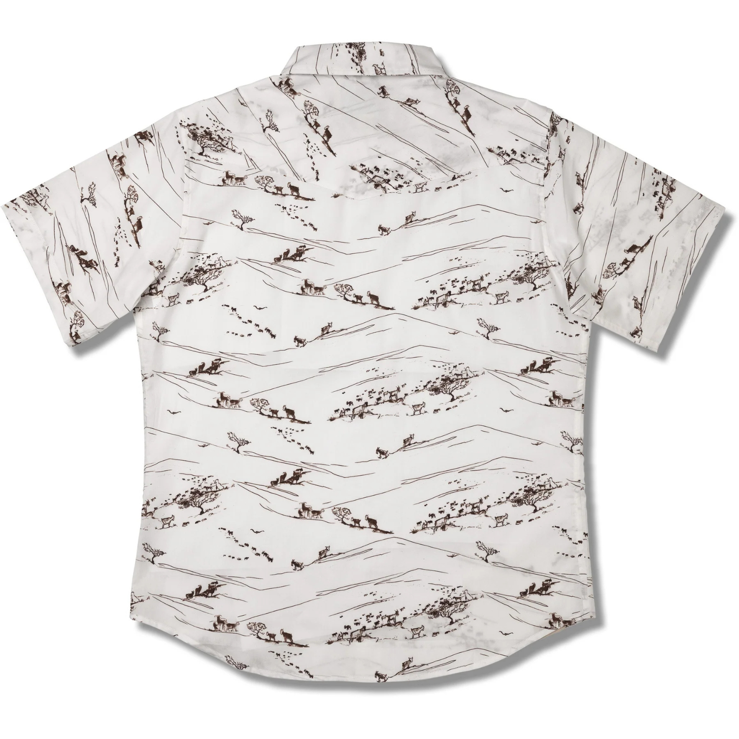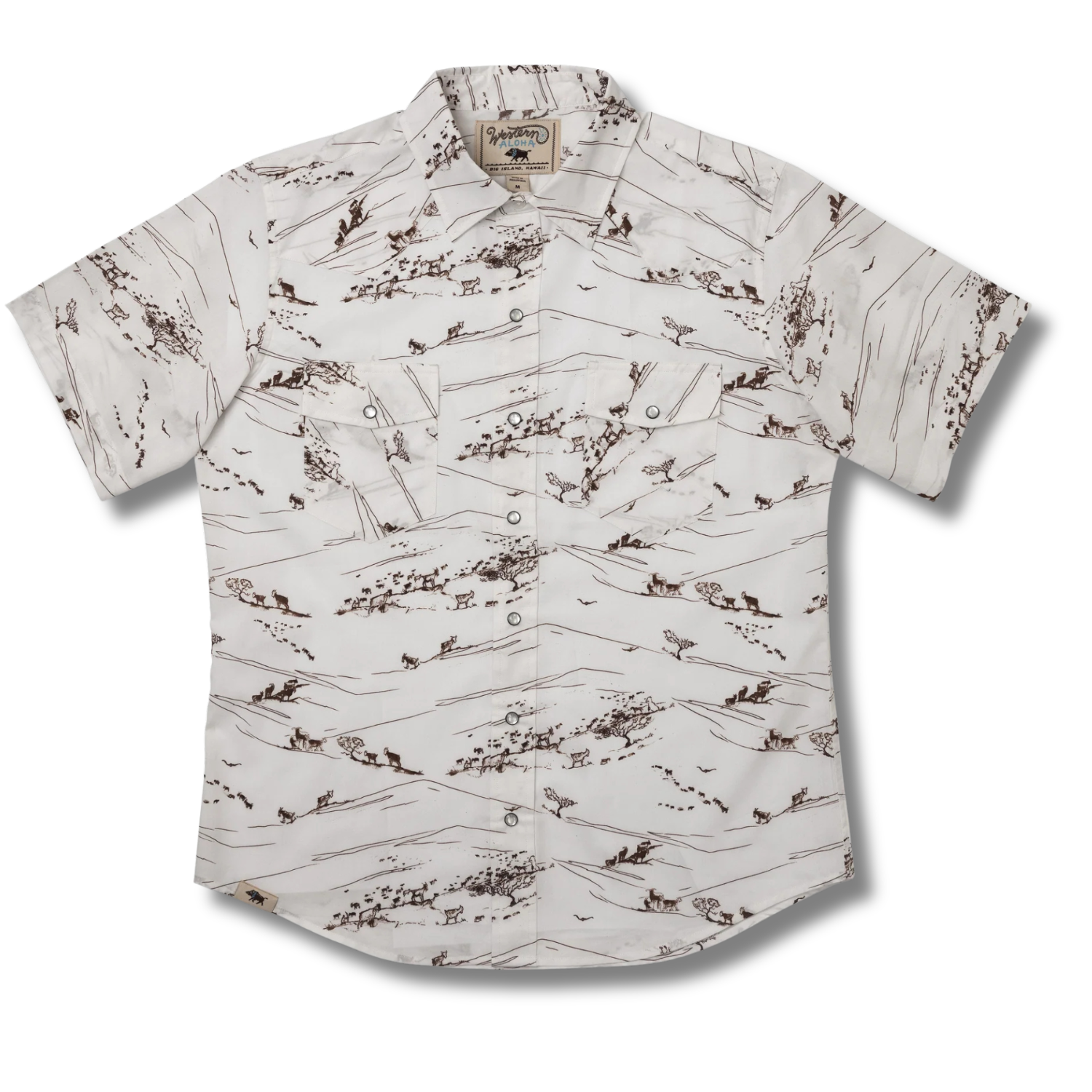 Inspired by the rugged terrain and surreal beauty of Hawai‘i’s Saddle Road, this short-sleeve from Western Aloha captures the spirit of high-altitude drives between Mauna Kea and Mauna Loa. The landscape may be otherworldly, but the shirt keeps it grounded with Western details like pearl snaps and shoulder yokes. Made from breathable, quick-drying Cowboy Cloth, it’s built for everything from winter coastlines to warm lava fields. Designed by artist Christian Enns, the reverse print holds the spirit of the islands close to the chest.