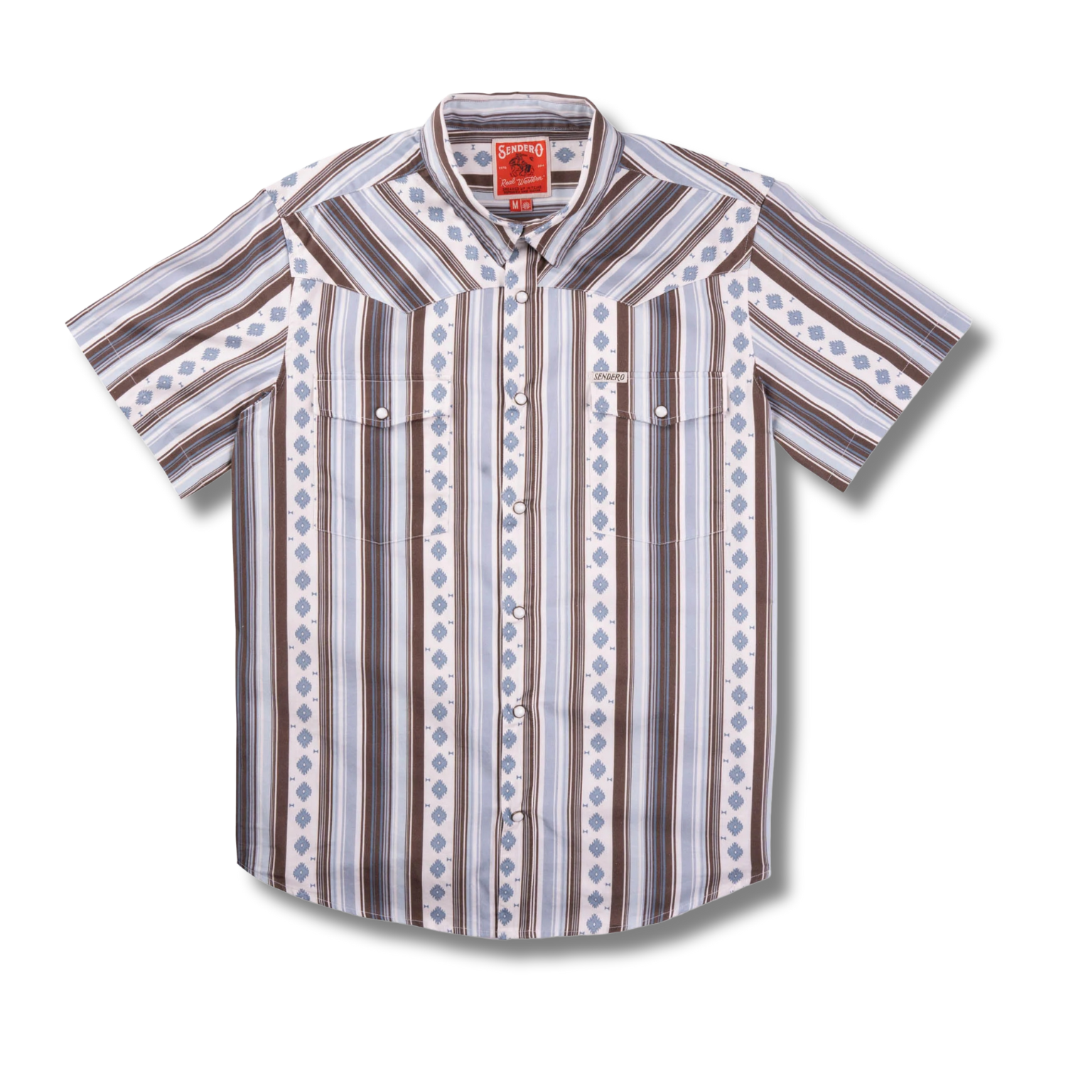 Y'all, get ready to stand out with the Serape Pearl Snap Short Sleeve. This shirt's got a serape-inspired Western stripe print that'll catch eyes from across the room. Made with 100% cotton, it's as comfortable as a breeze on a hot Texas day. It's not just about looks though; this shirt packs true Western details, including classic yokes and those iconic pearl snaps that add a touch of cowboy authenticity. Finished with Sendero Western labels, it's a shirt that says you know your roots and ain't afraid to show 'em.