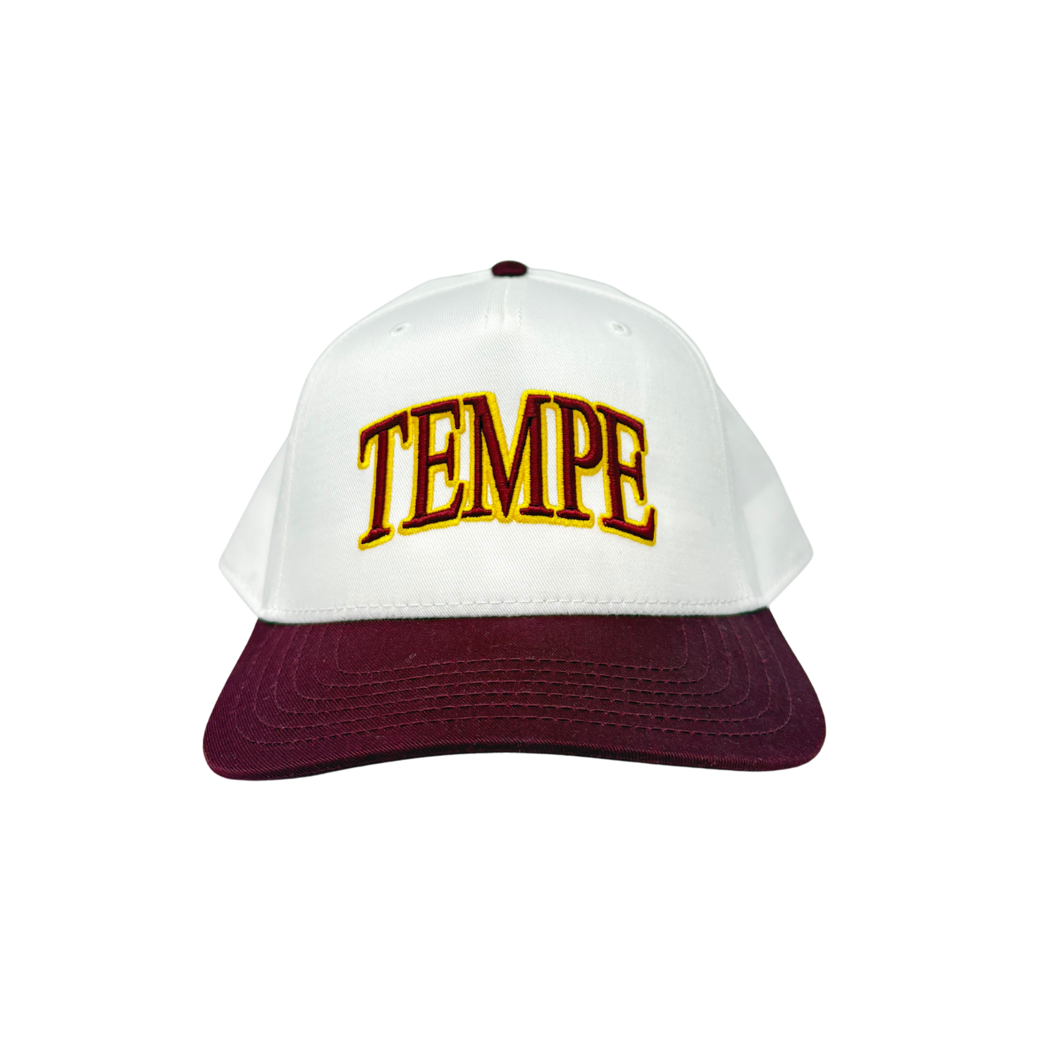 The Tempe Hat pairs bold embroidery with a clean two-tone design that highlights city pride. Built on the OTTO Cap 31-069 5-Panel Mid Profile Baseball Cap, it features a structured white crown, maroon curved visor, and raised “TEMPE” embroidery in gold outlined with maroon. Durable and dependable, the cotton-blend twill construction is designed to hold its shape, while the adjustable snapback delivers a comfortable fit for everyday wear.