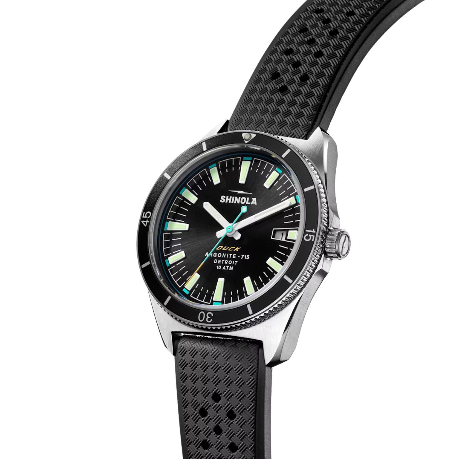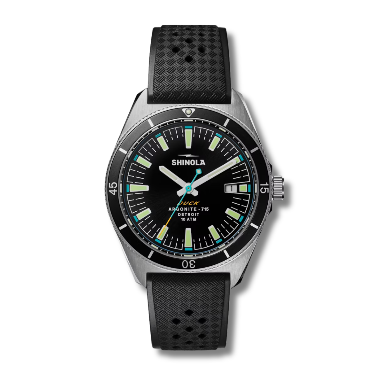 The Duck 40mm from Shinola takes its cue from the skin-diving gear of the past—built tough, built smart, and made to move through water and life with ease. With a 40mm stainless steel case, flat sapphire crystal, and a screw-down crown, this sport watch is rated for 10 ATM and ready for action. A sandblasted black sunray dial features bold lum-stripe indexes with C3 SuperLumi-Nova, backed by semi-matte alabaster hands and a seconds hand tipped in yellow. It’s all tied together with a reimagined tropic-style rubber strap featuring a basketweave texture for comfort and grip. Flip it over, and you’ll find a custom-etched caseback with a nod to its namesake. Functional, reliable, and right at home in any element.