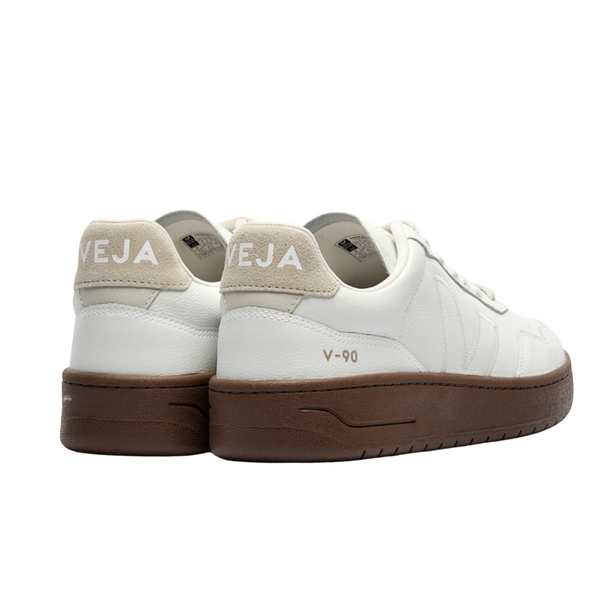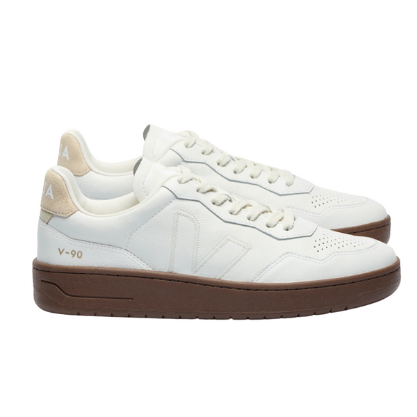 The Veja V-90 White Pierre Almond steps up with a mix of organic materials and clean lines that suit everyday wear. The upper and paneling are made from Veja's Organic Traced leather, sourced from certified organic farms in Uruguay and treated with minimal dyes for a softer finish. Touches of suede add texture, while the lining made entirely of recycled polyester brings added comfort. The insole and outsole feature a thoughtful mix of Amazonian rubber, sugarcane-based E.V.A., and other bio-based elements, making this sneaker a reliable pick for those looking for durability and environmental mindfulness. Made in Brazil, the V-90 keeps things grounded in performance and conscientious design.